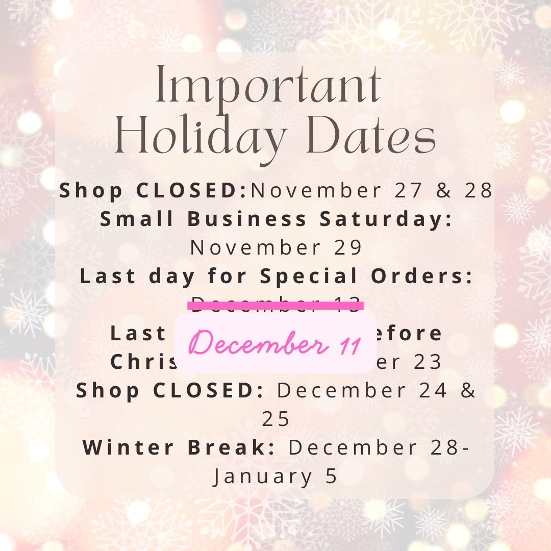 Please keep these dates in mind over the next few weeks as you plan out your holiday shopping. UPDATE: We've moved up our Special Order deadline to Thursday, December 11.
