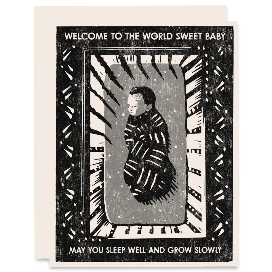 Digital woodcut, offset printed with ink made from renewable biopigments, 100% post-consumer recycled paper, A2, blank inside, cello sleeve with envelope.